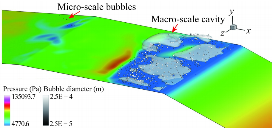 ● 方向2,多尺度空化流数值计算方法。主要开展多尺度空化流动结构仿真,离散空泡数值建模以及大小尺度空泡跨尺度建模方法研究。建立了基于离散-连续多尺度空化模型及重叠网格的空化流算法软件。