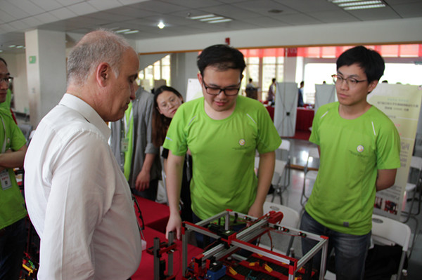 的9支参赛代表队获得了5个一等奖、3个二等奖、1个三等奖的历史佳绩。一等奖作品分别为复合式三轴移动停车装置(由杨金林、赵德明指导,成员为周佳颖、窦岩杰、孙晓航、张荣滔、徐继垦)、智能立体小型停车装置(由杨金林、张国凤指导,成员为陈锦鸣、张鹏勇、张钿、王郁、周哲佳)、智能无干扰立体车库(由马善红、杨金林指导,成员为苏冉、沈晓强、齐希阳、李翔毅、陈培杰)、双行式半自动手推式菠萝采摘收集机(由杨金林、杜小强指导,成员为张谦、余润尧、李禹、郑梁梁、黄皓杰)、辅助人工菠萝采摘机(由马善红、俞亚新指导,成员为龚骏飞、肖扬、张国建、王帅、叶方成)。除此之外,我校还获得了特别贡献奖。同时,在大赛闭幕式的最后环节中,全国大学生机械创新设计大赛组委会秘书长王晶教授、德国慧鱼集团国际事务总监劳伦斯先生、韩国av