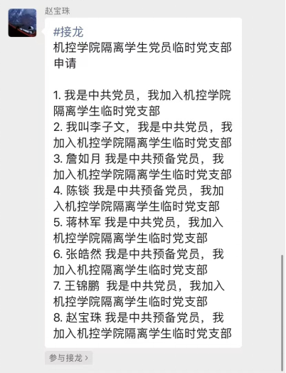 会议期间,研究生党员詹如月倡议隔离党员成立临时党支部,并向学院党委提出申请,做到共产党员主动亮身份,担责任,为同在隔离状态的同学提供服务和帮助,发挥党员的先锋模范作用。