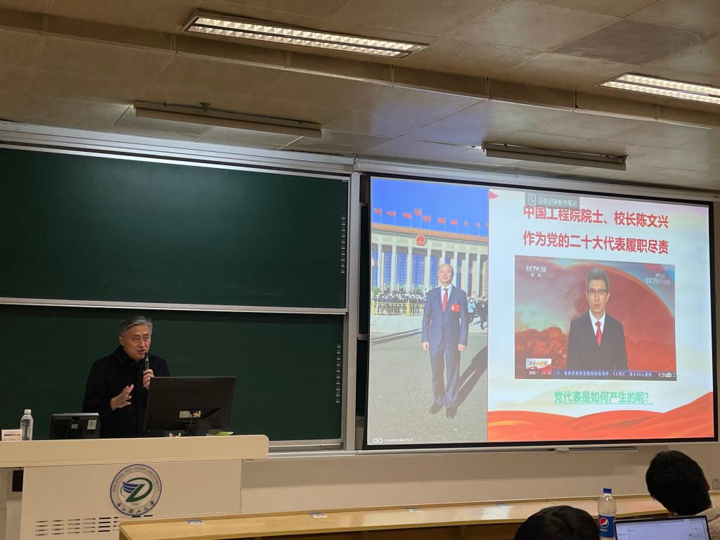 12月1日,形势与政策课堂上,陈正奎围绕“自信自强、守正创新,积极投身民族复兴大业”的鲜明主题展开,以陈文兴校长作为党的二十大代表光荣参会的例子开篇,从“大会主题、主要成果和报告起草过程”、“全面学习贯彻党的二十大精神”、“对马克思主义中国化时代化、中国式现代化、全面建设社会主义现代化国家的目标任务”三个方面内容的七个重点部分对党的二十大精神进行系统宣讲和深入解读。