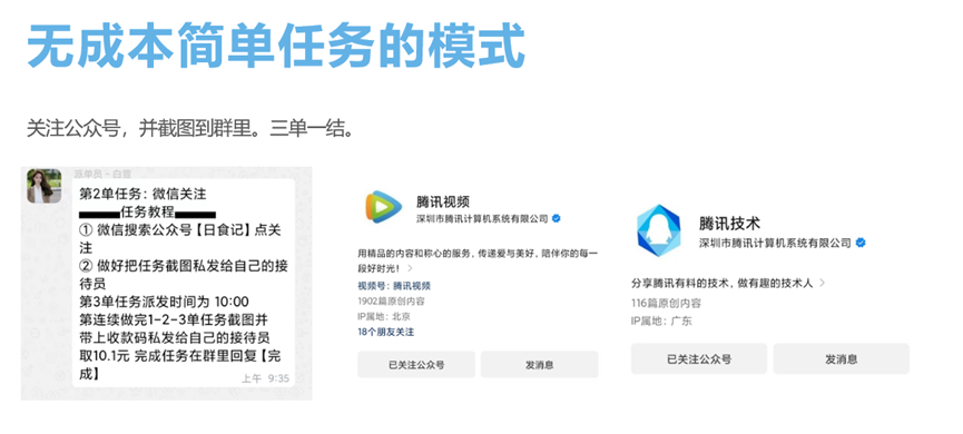 2、加群做任务:无成本赚钱任务,配合内部拖尝到甜头(任务都是关注腾讯视频等高知名度公众号,打消疑虑)。