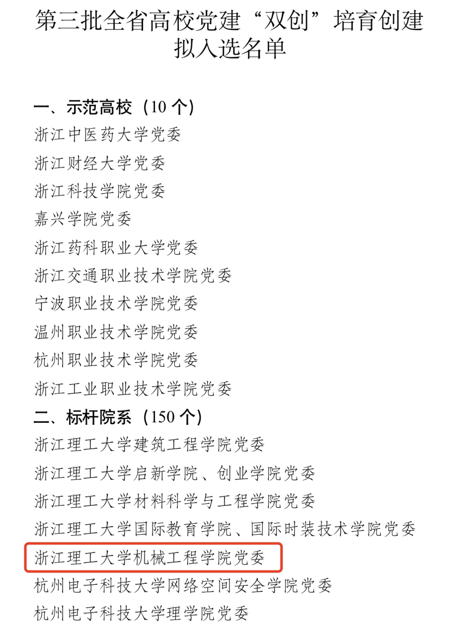 为深入学习贯彻习近平新时代中国特色社会主义思想,纵深推进高校党建示范创建和质量创优,中共浙江省委教育工作委员会于2023年5月启动第三批全省高校党建“双创”培育创建工作。近日,中共浙江省委教育工作委员会发布通知,根据《中共浙江省委教育工作委员会办公室关于开展第三批全省高校党建“双创”培育创建工作的通知》,经自主申报、综合遴选、省教育厅党组会审议和公示等程序,确定10个高校党委、150个院系党组织、151个基层党支部、50名研究生党员为第三批全省高校党建“双创”培育创建对象。